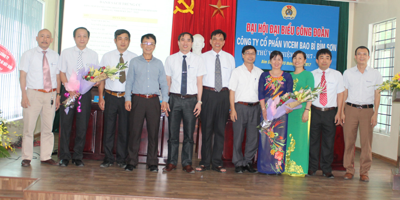 Chủ tịch công đoàn Tổng công ty công nghiệp xi măng Việt Nam và Giám đốc Công ty tặng hoa và chụp ảnh lưu niệm với Ban chấp hành Công đoàn Công ty khóa 6 nhiệm kỳ 2017 - 2022
